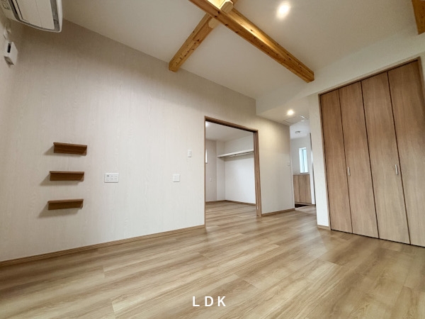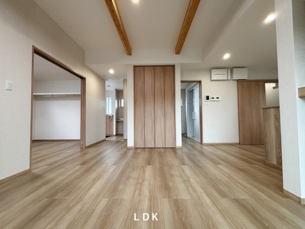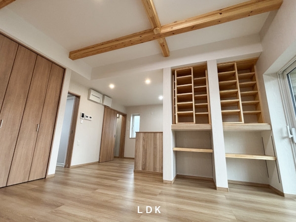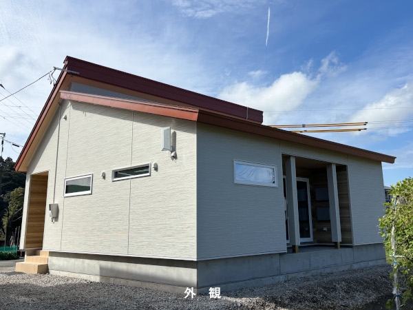 夫婦2人で住む平屋のお家。時間と家事の負担を減らす回遊動線。趣味の部屋と夫婦の寝室。梁表しの広々高天井のLDK。お施主様の希望と夢がたっぷり詰まったお家が完成しました。