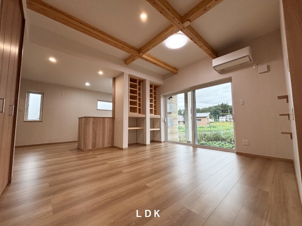 ●梁表しの高天井リビングに併設した土間デッキ